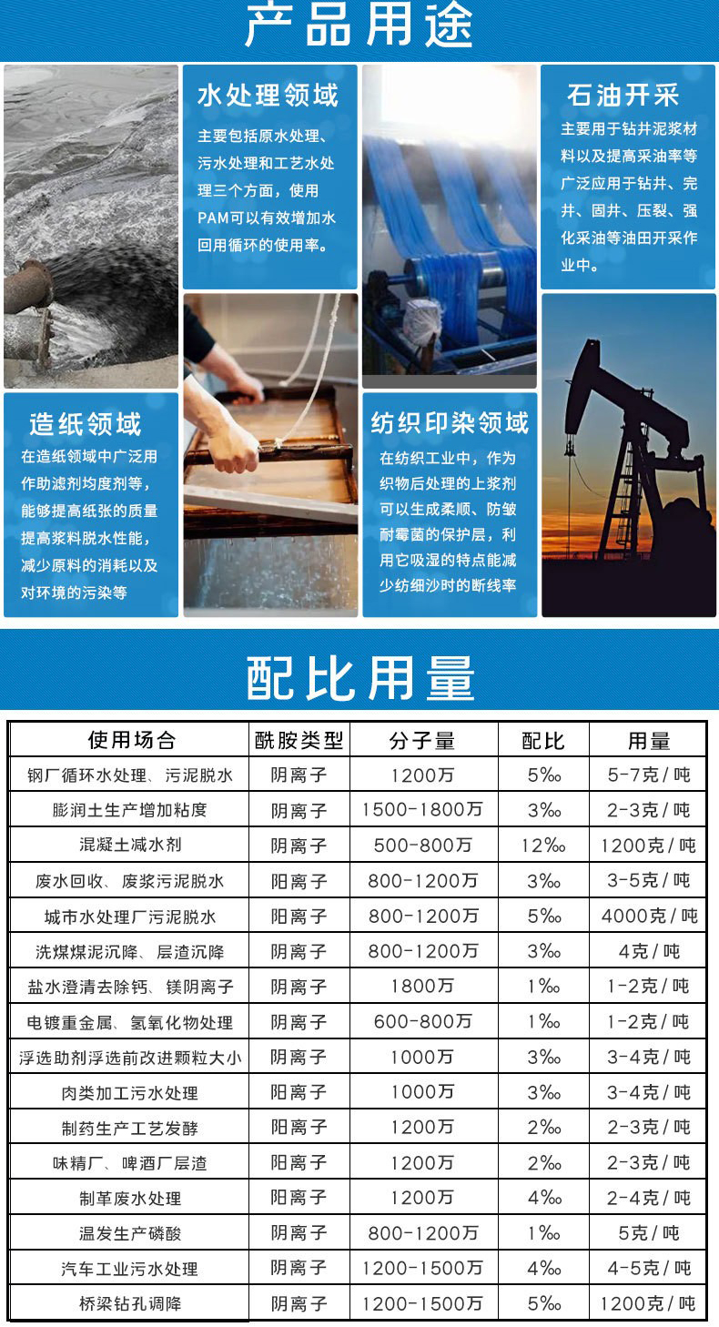 陽離子聚丙烯酰胺通過交聯(lián)吸附的網(wǎng)狀結(jié)構(gòu),作為了一類重要的絮凝劑  增稠劑  減阻劑  泥漿處理劑 表面活性劑 土壤改良劑,水土保濕劑 造紙 印染紡織增強劑等;在石油開采  水處理 紡織造紙 選礦 醫(yī)藥等行業(yè)中廣泛用到。所以被稱之為 百業(yè)助劑。